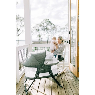 The Baby Delight® Slumber is a rocking bassinet designed for portability and for small spaces. The Slumber’s Charcoal Tweed fabric and clean lines make it sleek and modern, while the optional canopy and netting add design features for any situation – both indoors or out. All of our sleep products have mesh walls for visibility and breathability and the Slumber is no different. Depending on your preference, the Bassinet can be manually rocked or locked into a stationary position. The entire cover, along with the included sheet are machine washable. The Baby Delight® Slumber conveniently folds up in seconds and can be put into the included carry bag for travel or storing.