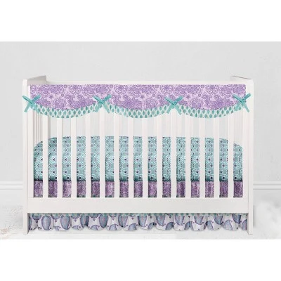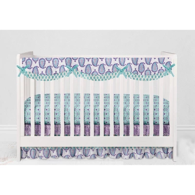 - This Bacati 6-piece Crib Set Includes Reversible Comforter/Playmat (33 x 43 inches), Crib fitted sheet (52 x 28 x 6 inches), Crib Skirt/Dust ruffle (13 inch drop) Diaper Stacker (holds more than 30 newborn diapers), Reversible Long Crib Rail Guard Cover (52 x 12 inches) and Window Valance (15 h x 56 w inches with 1.75 inch Rod Pocket) in fun, colorful and signature prints in 100 percent cotton 200 Thread Count percale fabrics. Designed in United States by Experienced Designers. Many coordinating items available to purchase separately in this Bacati Paisley Isabella Purple Lilac Aqua Bedding Collection.