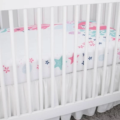 Your little one will sleep soundly on this Disney Baby crib sheet’s cozy surface and cute design with everyone’s favorite under-the-sea Disney Princess, Ariel. Perfectly Instagrammable shades of blue, aqua, coral and pink make this 100% polyester microfiber crib sheet stand out in photo ops. Measures 52 x 28 x 8″ with elastic all the way around for a perfectly snug fit on any standard size crib mattress.