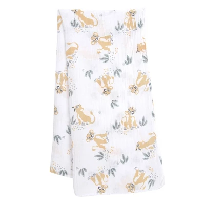 Wrap your little one in total comfort with this breathable 100% cotton muslin swaddle blanket. It features Lion King along with various plants and leaves on a soft white ground. This set also includes a cute little Lion King plush made in a soft velour. He is approximately 4 ½” tall. His face is embroidered making him baby safe. This set makes a great baby shower gift or welcome home baby gift.