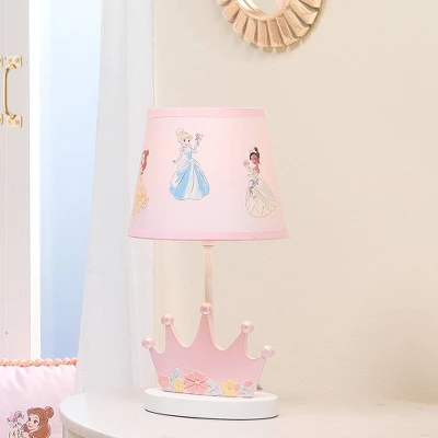This officially licensed Disney Princesses âgrow with meâ lamp will add a soft glow to your little girlâs room. The lamp features a custom molded resin crown in a soft pink color. It is accented with a raised floral garland hand painted in pink, yellow and green flowers in a pearlized finish. The lamp shade is 6â in height and has all three Disney Princesses dressed in their favorite ballgowns. An energy efficient CFL 13W light bulb is included.