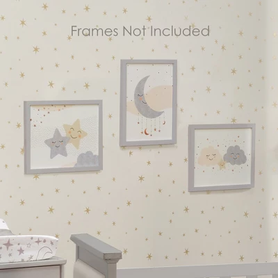 - One print features smiling clouds, one a gray crescent moon with smaller copper metallic stars and moons, and one with two smiling stars, a cloud, and a trail of metallic stars