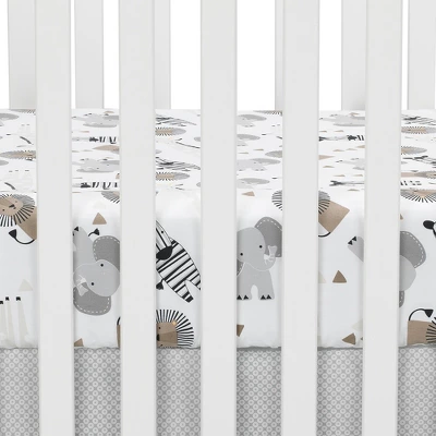 - This soft 100% cotton, breathable fitted baby crib/toddler sheet features a gender neutral tossed animal print including elephants, lions, zebras and giraffes on a white background. Perfect for any baby boy or girl nursery.