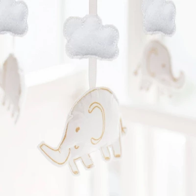 Sweet gold and white elephant baby mobile will lull your little one to sleep. Lull your baby to sleep with our gold and white elephant baby mobile. The rotating baby mobile features sweet elephants hanging down for your baby to watch and fall asleep to. This crib mobile fits standard size crib rails. Rotating wind up mobile plays Brahm’s Lullaby. Use from birth to about 5 months or remove from crib when baby begins to push up on hands and knees.