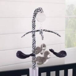 The NoJo Seas The Day Musical Mobile features whales and sea lions. The mobile arm has a coordinating navy hatched print sleeve. Plays Brahms lullaby. Fits onto most standard and convertible cribs. This fun Musical Mobile coordinates with a full line of Little Love by NoJo Seas The Day Nursery Collection.
