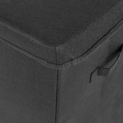 Our Black Felt Toy Box is a great multi-purpose storage piece for any living space. Stash toys, books, blankets, clothes and keepsakes in this bin. The attached hinged lid features a tailored fold-over finish that brings an elevated elegance to this everyday storage bin. The toy box features a solid black exterior and inner lining. Coordinating accessories and room décor by Sammy and Lou are available and sold separately.