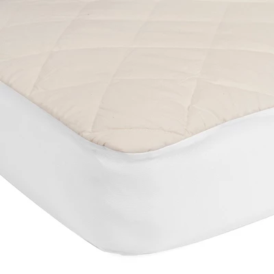 The Sealy Quilted Fitted Crib Mattress Pad with Organic Cotton Top offers natural comfort for your little one plus waterproof protection to help keep baby’s mattress clean. A premium, GOTS Certified 100% organic cotton top is soft and comfortable on baby’s skin for a superior feel and natural coziness. For added comfort, this crib pad features quilted, hypoallergenic fill made from easy-clean polyester to keep infants and toddlers comfy at night. The TPU waterproof barrier protects mattresses from diaper leaks and moisture, plus this crib mattress cover is machine washable and dryer friendly for easy cleaning. A premium SecureStay fitted skirt wraps underneath baby mattresses for snug fit, while the elastic edge helps prevent sliding, shifting, and bunching for security. The Sealy Quilted Fitted Crib Mattress Pad with an Organic Cotton Top measures 52” x 28” for a perfect fit on both standard full-size crib and toddler mattresses.