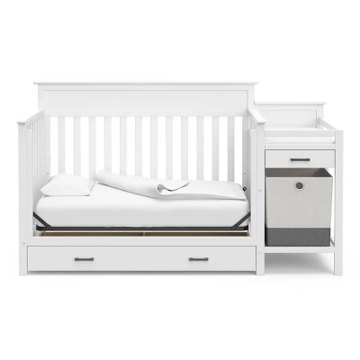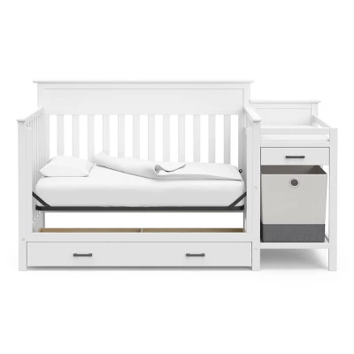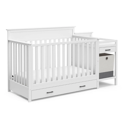 A feature-filled, all-in-one nursery solution – the Storkcraft Arizona 4-in-1 Convertible Crib and Changer combines timeless style, modern design, and touches of elevated designer details with the all-in-one convenience of an attached changing table, full-size drawer, and portable storage hamper. The Arizona Crib Convertible Crib and Changer’s attached changing table features a water-resistant baby changing pad, safety strap, a conveniently-sized additional storage drawer for quick access to nursery essentials, and two open shelves. The Arizona’s full-size under-crib storage drawer provides extra nursery storage, while the portable, standalone fabric hamper is perfect for storing laundry or toys.