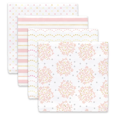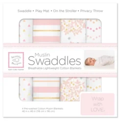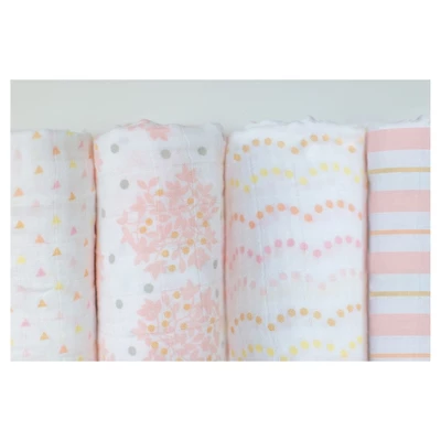 - Set of 4 lightweight, baby soft cotton swaddle blankets in complementary prints