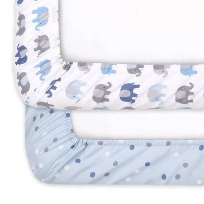Marching elephants line up in shades of blue and gray on a crisp white ground in one sheet, while the sweetest confetti dots are tossed in shades of gray, cobalt, and white on a beautiful sky blue ground in this Sleepy Elephant 2pk Microfiber Sheet set from The Peanutshell. Microfiber fabric is touchably soft and the easiest of care; pack of two allows for quick changes. Perfect for any baby’s room – a boy, a girl, or both!