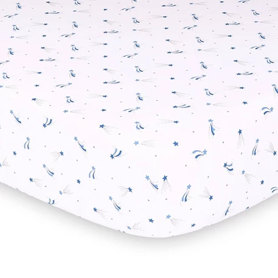 Get ready to blast off to the outer limits of cuteness with The PS by the Peanutshell Rocket Star Fitted Sheets. Two distinct styles allow you to mix and max other bedding accessories… pick from a starry night to rockets in flight. The navy and gray designs contrast the soft, white microfiber fabric. With two sheets included in the set, you’ll always have one at the ready for a quick change. Perfect for any little astronaut.