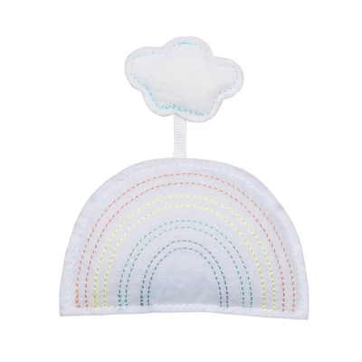 Encourage eye tracking and sound perception skills with this Rainbow Musical Crib Mobile by Trend Lab. The 1-inch banded mobile ring features a mint solid. Three rainbow colored stitched rainbows and five clouds are suspended from white decorative ribbon and slowly rotate to Brahms’ Lullaby. Crib Mobile fits standard crib rail up to 5 inches and measures approximately 24 in tall by 20 in wide when fully assembled.